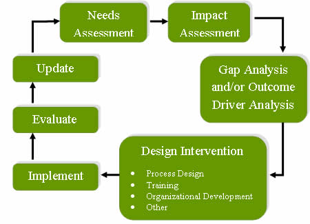 Organizational development services focus on developing organizational capacity and health at various levels (individual, inter-personal, group, inter-group, organizational and inter-organizational) and helping the organization manage change effectively. Although training is a fundamental part of organizational development and change, we treat training as a distinct function given its level of importance. As a result, organizational development services will mostly refer to interventions at various levels within the organization that don't involve traditional methods of training, and typically involve more direct intervention into the targeted part of the organization. For example you could provide employees with training on managing conflict but you could also request an OD intervention to deal with enduring and destructive conflict between particular employees. In order to view a presentation of why and how a particular manager might use organizational development services please click here. In addition to interventions that target various levels of the organization, the OD services provided include two fundamental processes that are embedded within the general intervention process (see below). Structured problem solving (gap analysis) and performance assessment are two essential tools for improving performance and health through out the organization. In order to view a presentation of why and how a particular manager might use structured problem solving please click here. In order to view a presentation of how managers can use the performance assessment process please click here. Managers can submit a request for OD services by clicking the request for services menu at the top of the page. Managers have the option of bundling business process design, training and OD services together in order to meet their process management, training and organizational development needs.